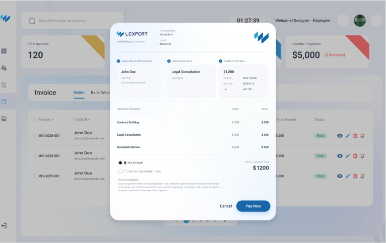 Generate unlimited invoices, link them to legal services, track expenses, and support online payments with full financial reporting tools.